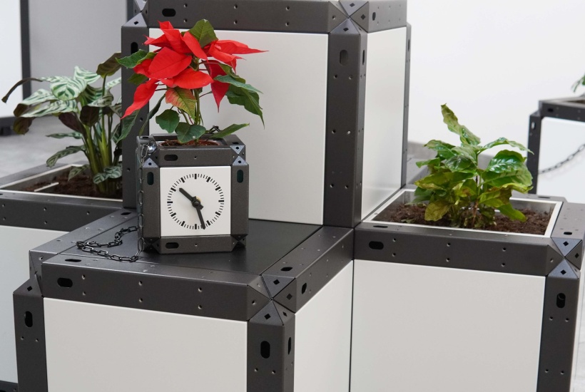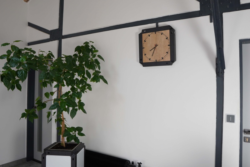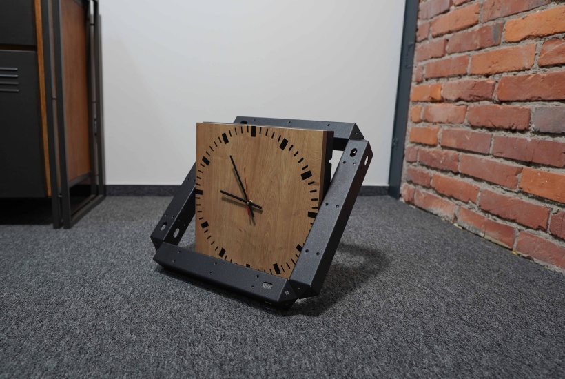 The stylish folding clock was created by creating a unique system of elements that fit together. These components created the outer skeleton of the clock, into which the dial was placed on a wooden base.