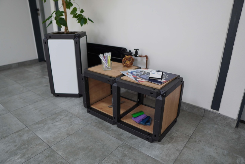 Interior wood storage for storing wood near the fireplace. The storage was made of three bent parts by welding. It was then coated with a matte black lacquer layer, which ensures high resistance to unwanted damage.
