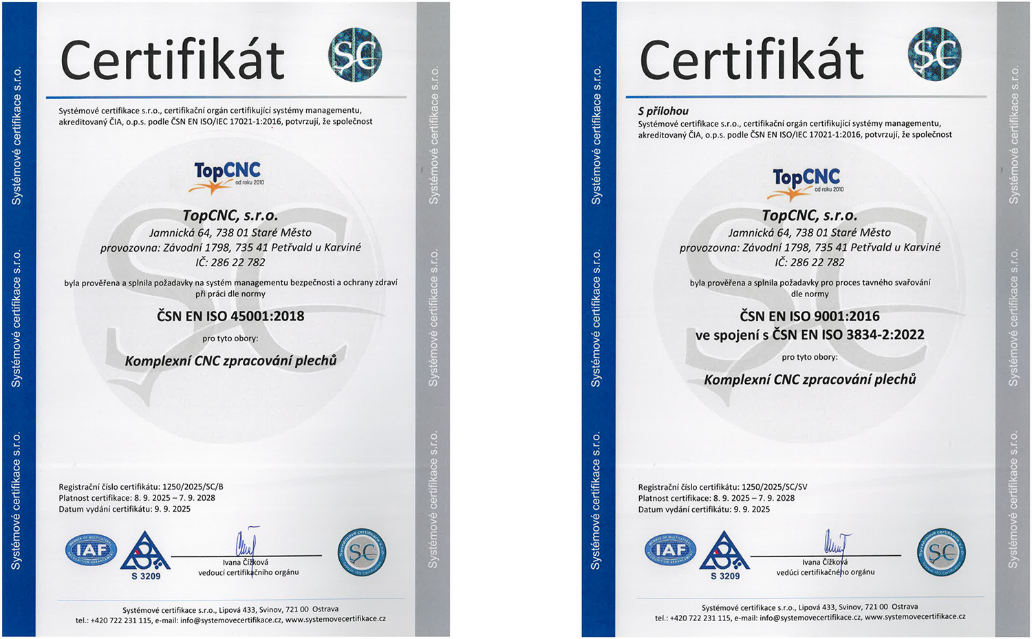 S potěšením oznamujeme, že naše společnost úspěšně prošla certifikačním auditem a získala mezinárodní certifikace ISO 9001 (systém řízení kvality), ISO 3834–2 (zvýšené požadavky pro proces tavného svařování), ISO 14001 (environmentální management) a ISO 45001 (bezpečnost a ochrana zdraví při práci).