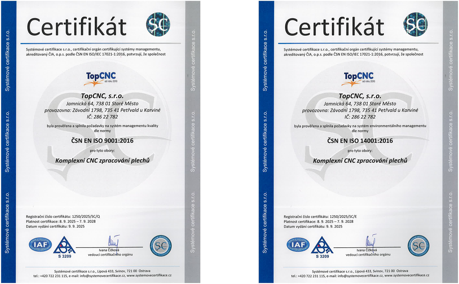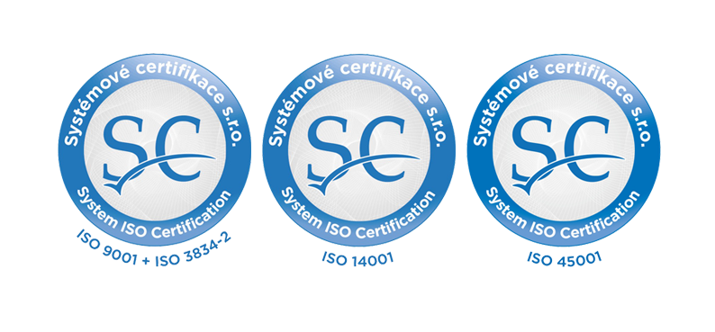 Tyto certifikace potvrzují náš dlouhodobý závazek k vysoké kvalitě výroby, odpovědnému přístupu k životnímu prostředí a k bezpečnému a zdravému pracovnímu prostředí pro všechny naše zaměstnance.